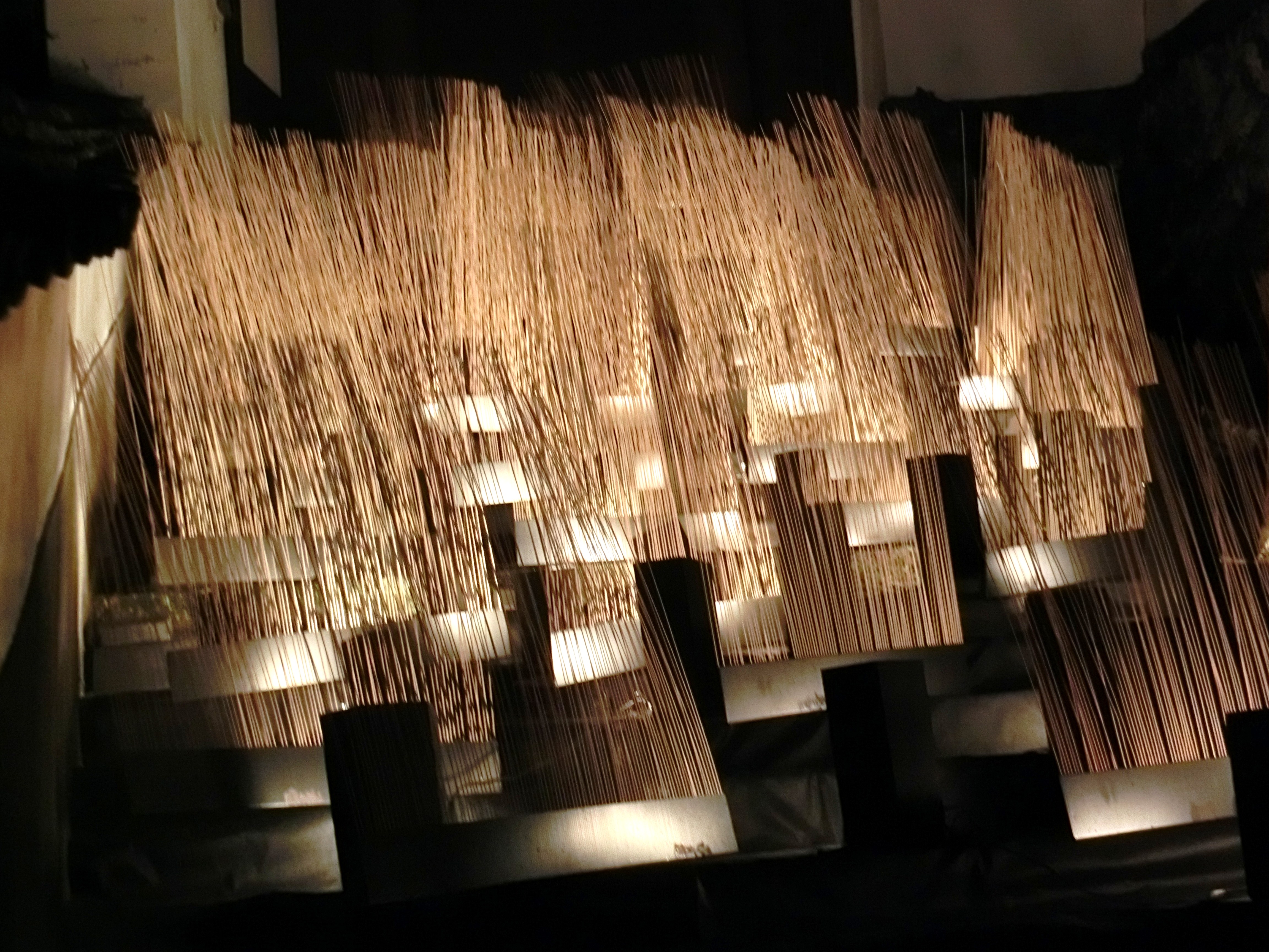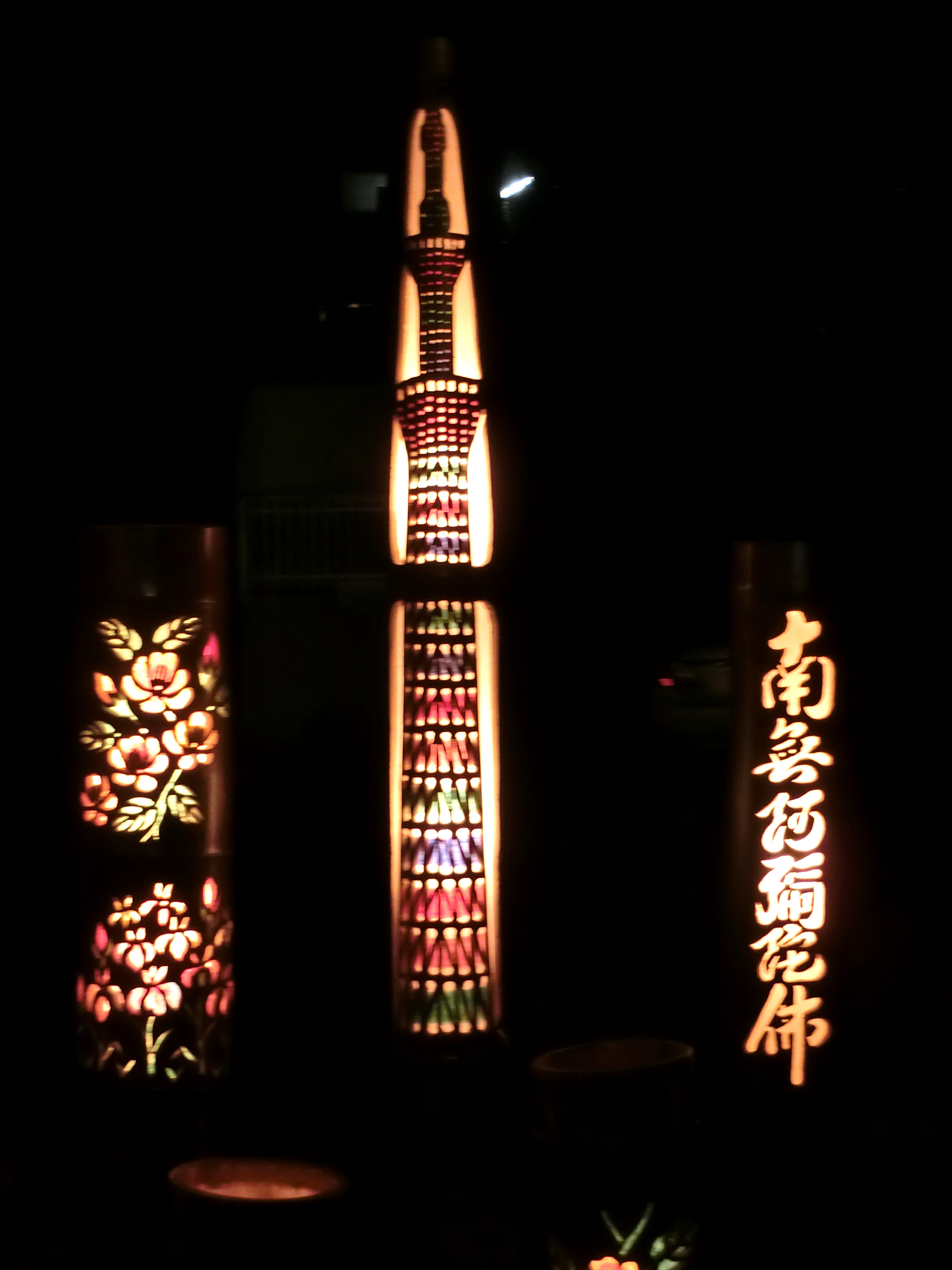 この行列に並んでいる間に向かい側のお寺を見ると、今までとは違う竹のオブジェが飾られています。
