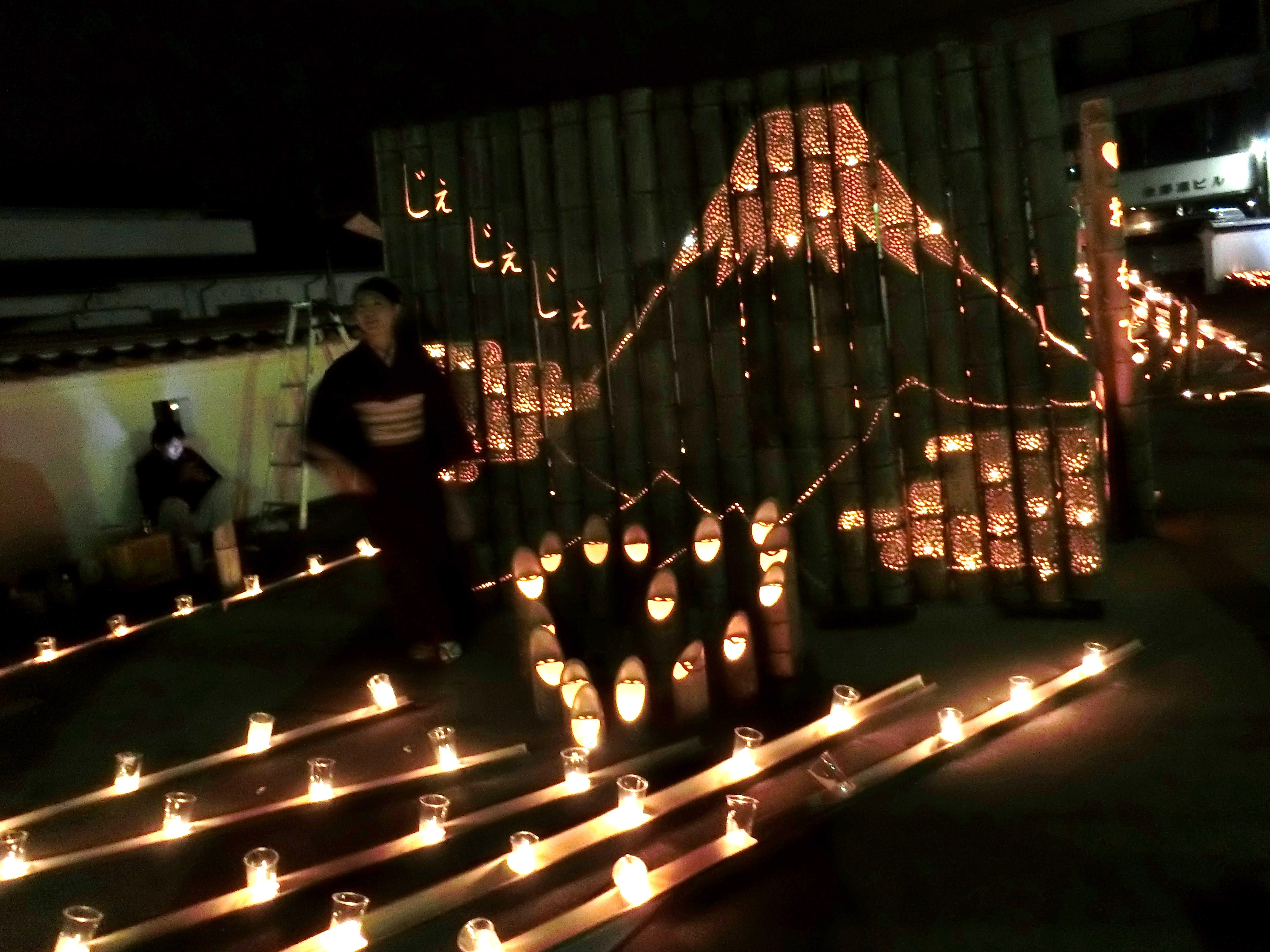 八町大路は賑やかで明るいですが、小さな路地に入ると、竹細工のオブジェが御迎えしています。