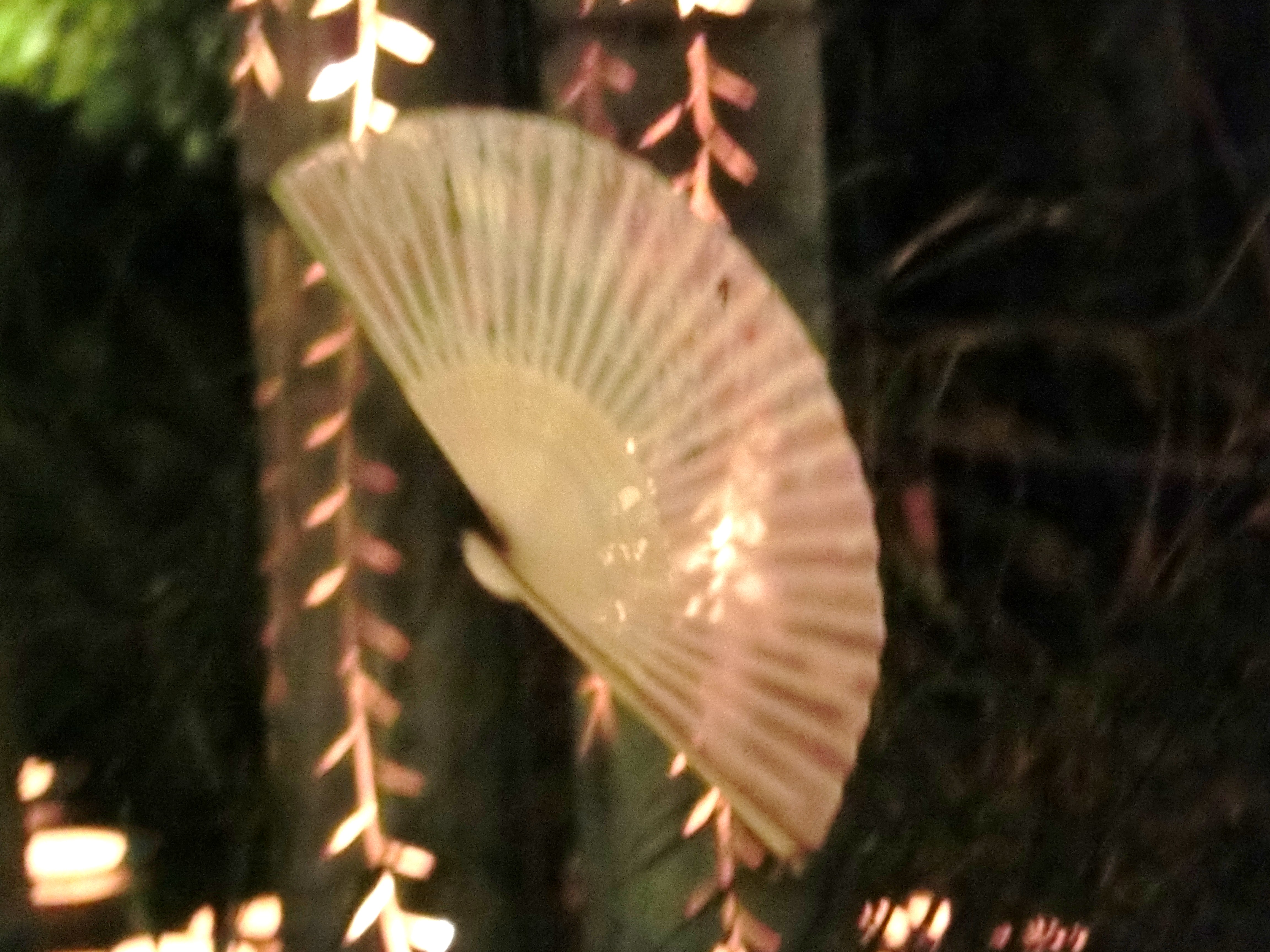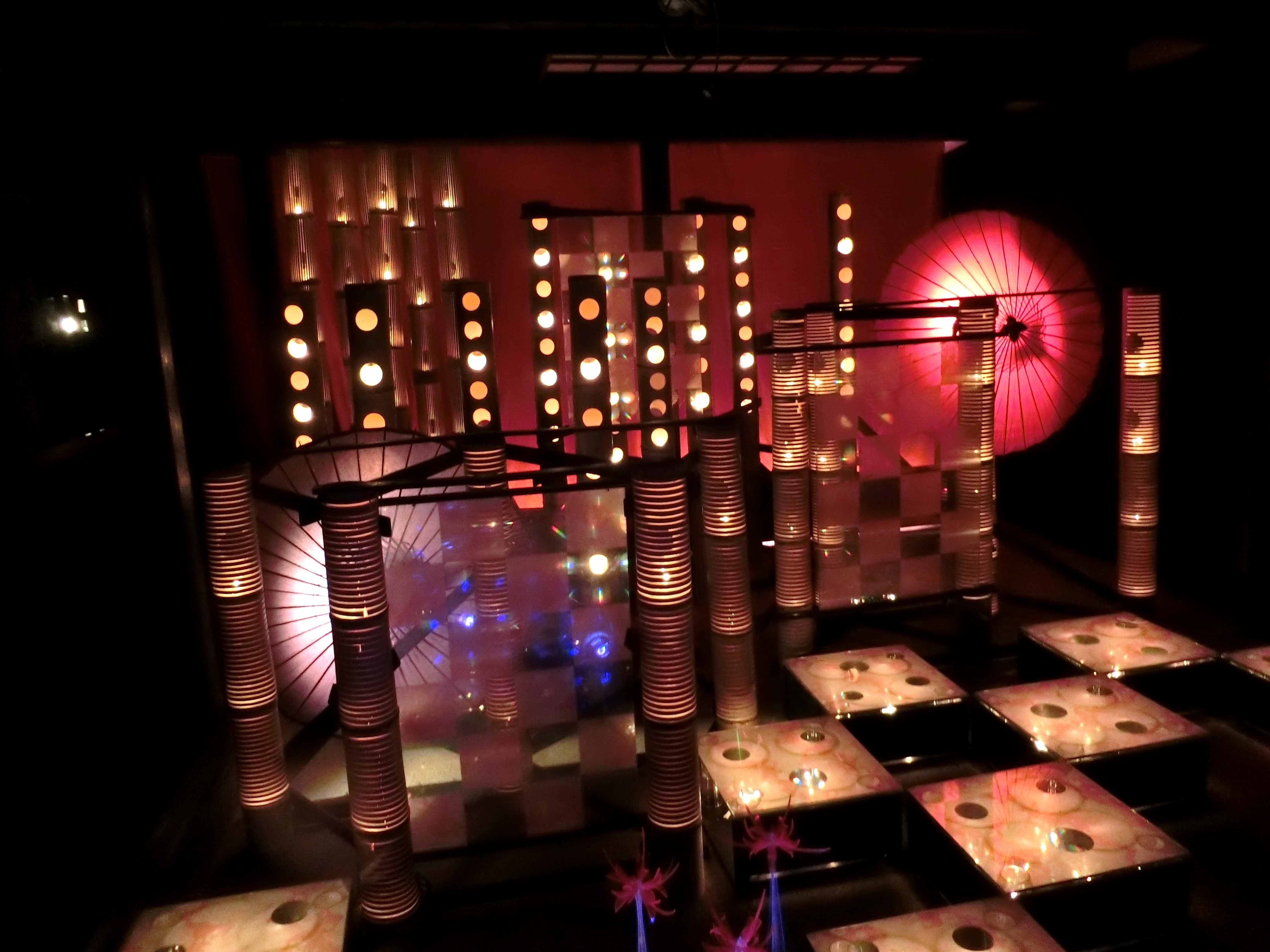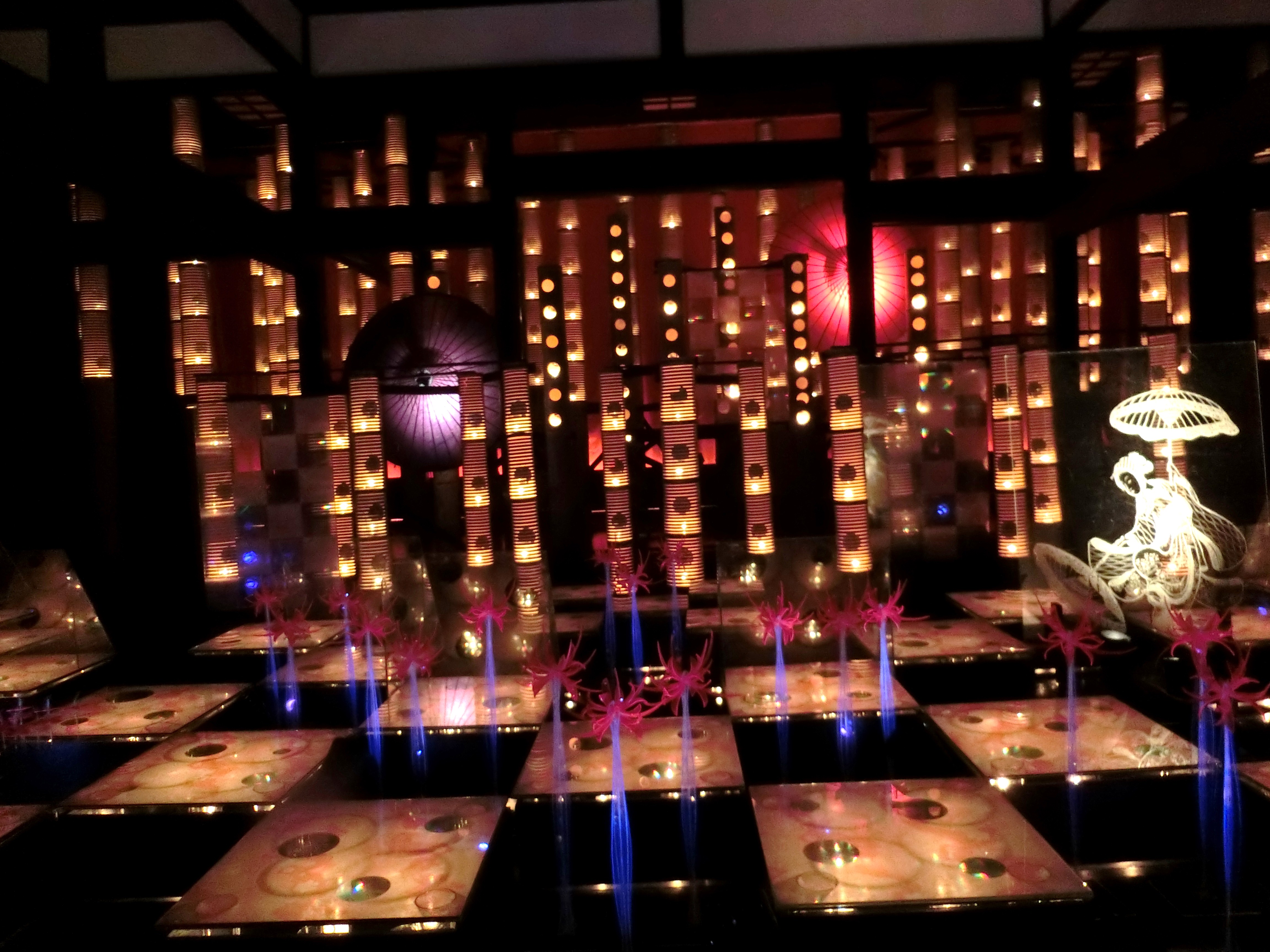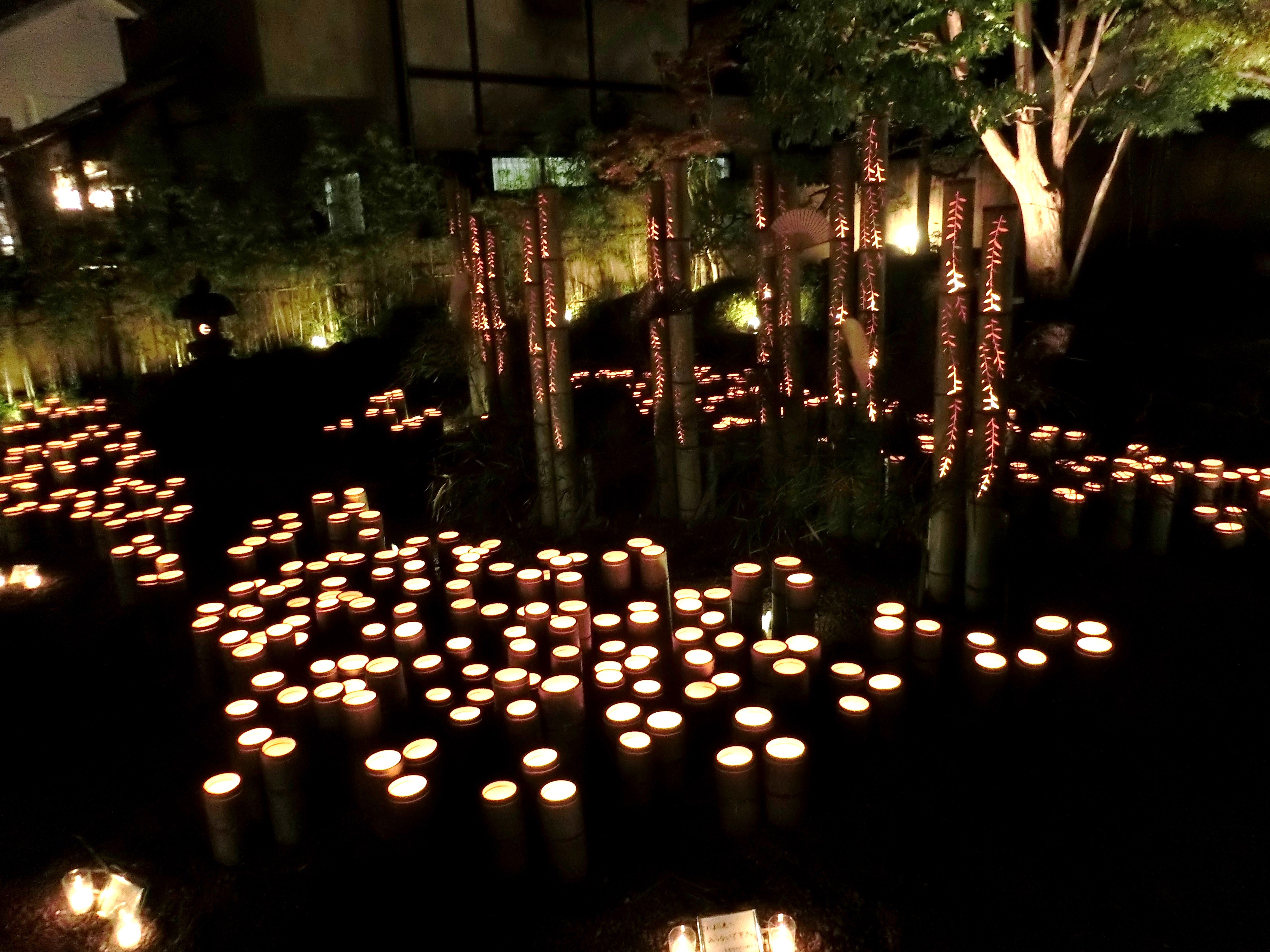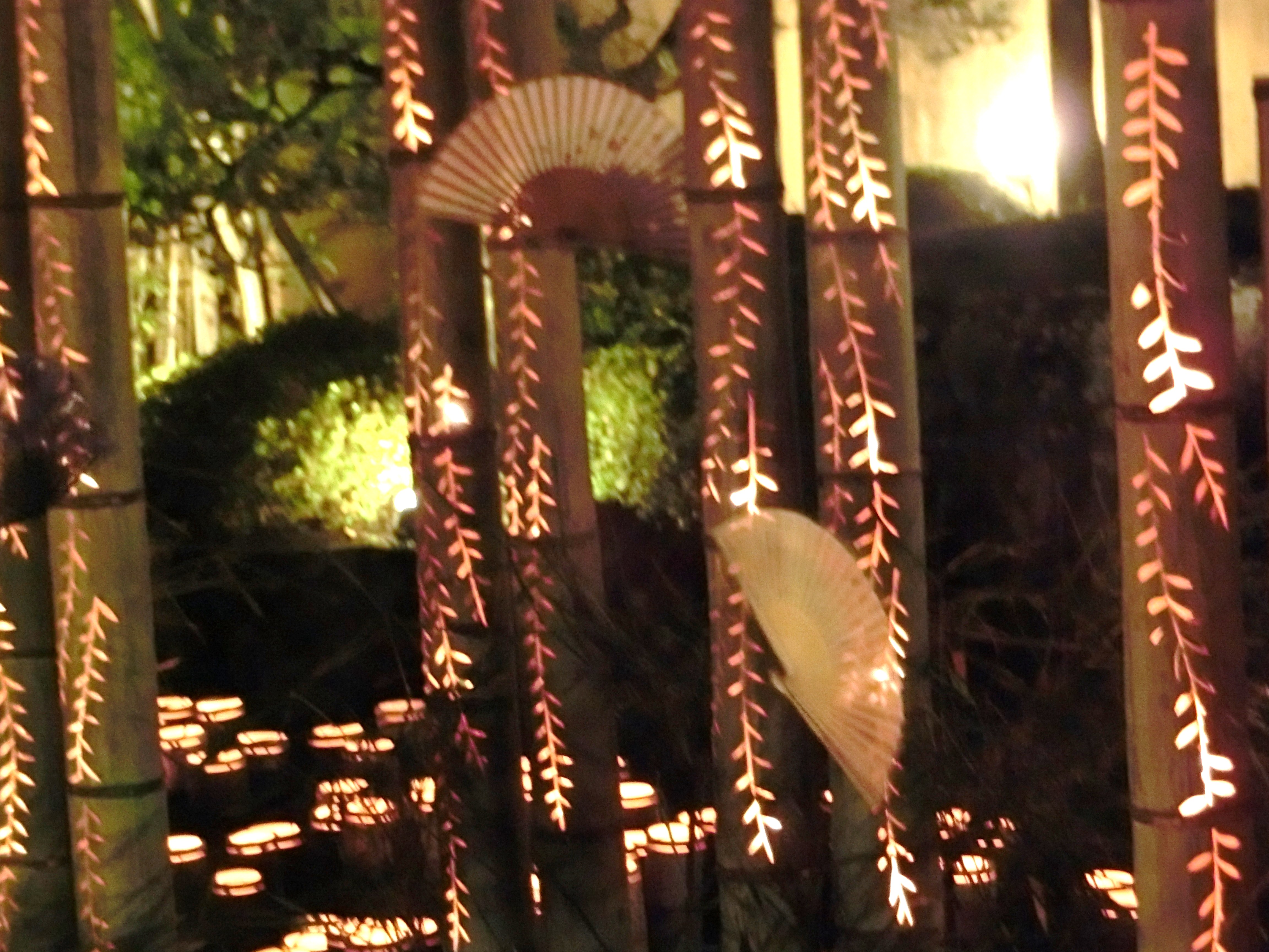 庭には、一面の竹のオブジェが、まるで浮かんでいるかのように照らしています。